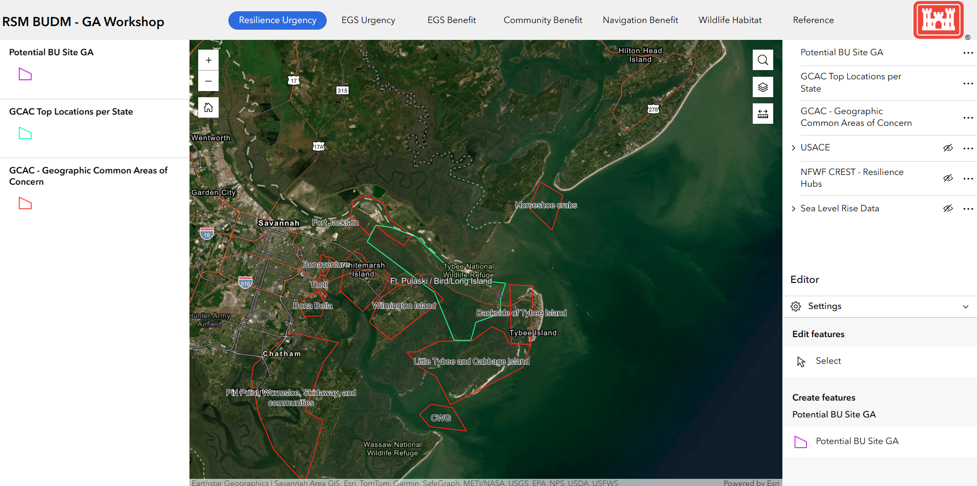 Screen capture of Online GIS Decision Support Tool developed as part of National Fish and Wildlife Foundation funded work for North Carolina, South Carolina, and Georgia. The image shows restoration opportunity areas, identified by workshop participants in December 2023, near Savannah and Tybee Island, Georgia. The Green and Red shapes outline the areas identified at risk of habitat loss. The small purple shape identifies a potential restoration project near Fort Pulaski National Monument at Cockspur Island Lighthouse. The site involves restoration of approximately 5 acres of eroded island and marsh. The project is one that may benefit from regularly scheduled operational maintenance dredging of the Savannah River by the US Army Corps of Engineers.