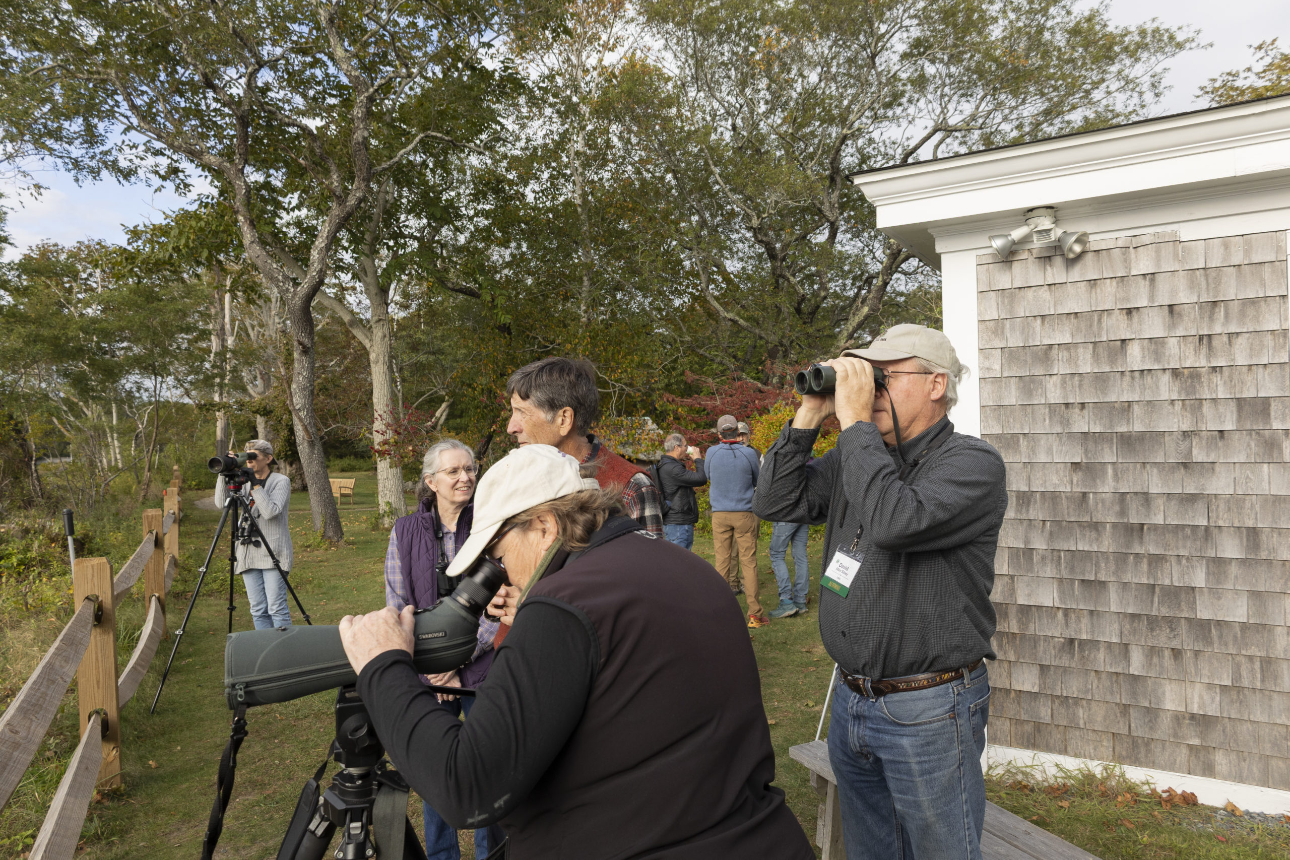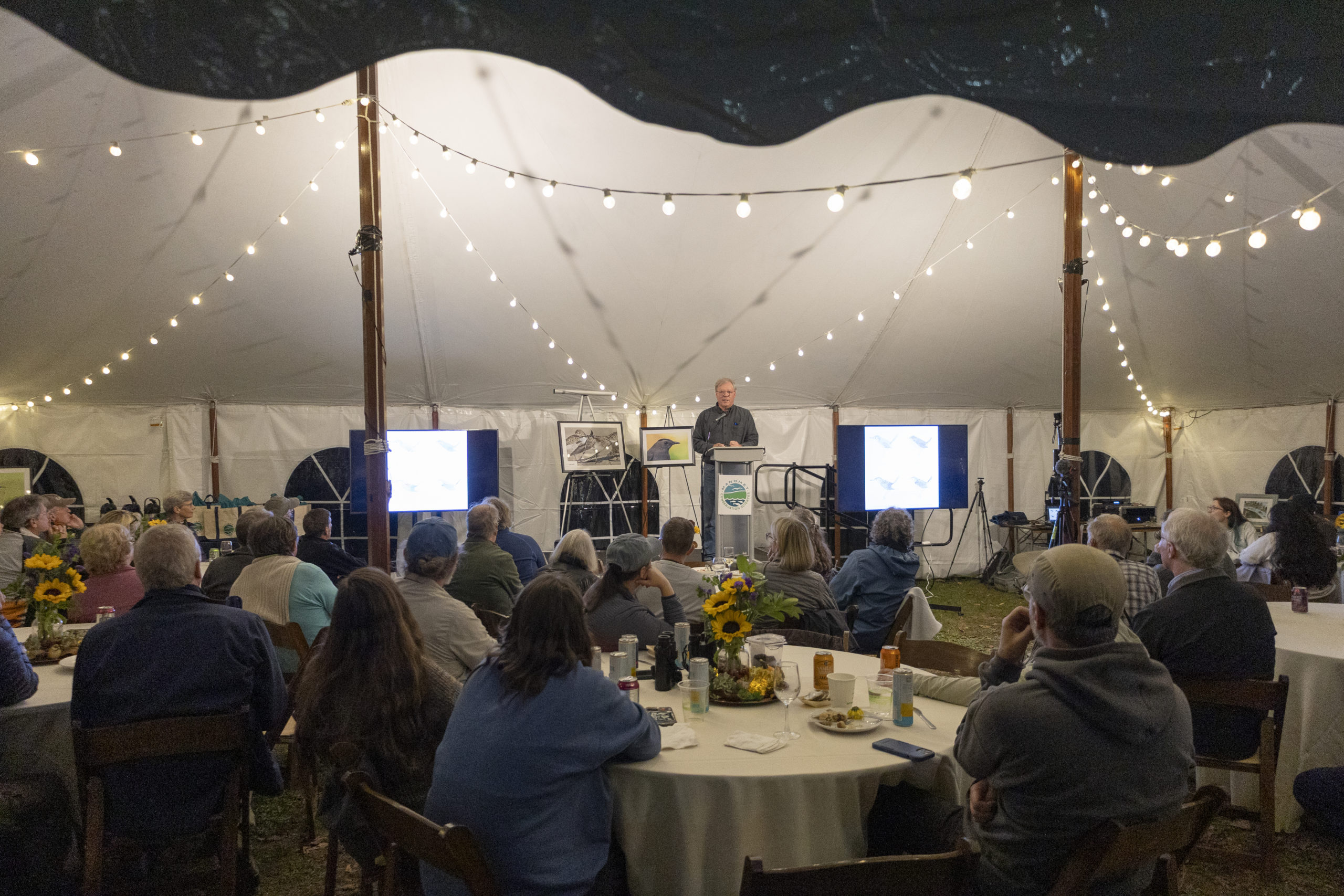 I had the privilege of documenting a special moment: an inspiring talk by David Sibley, a world-renowned ornithologist, artist, and member of the banding crew in the fall of 1983. Under the warm lights of the reunion tent, Sibley shared stories of warblers, sketches, and the long-lasting mark that Manomet left in his life journey.