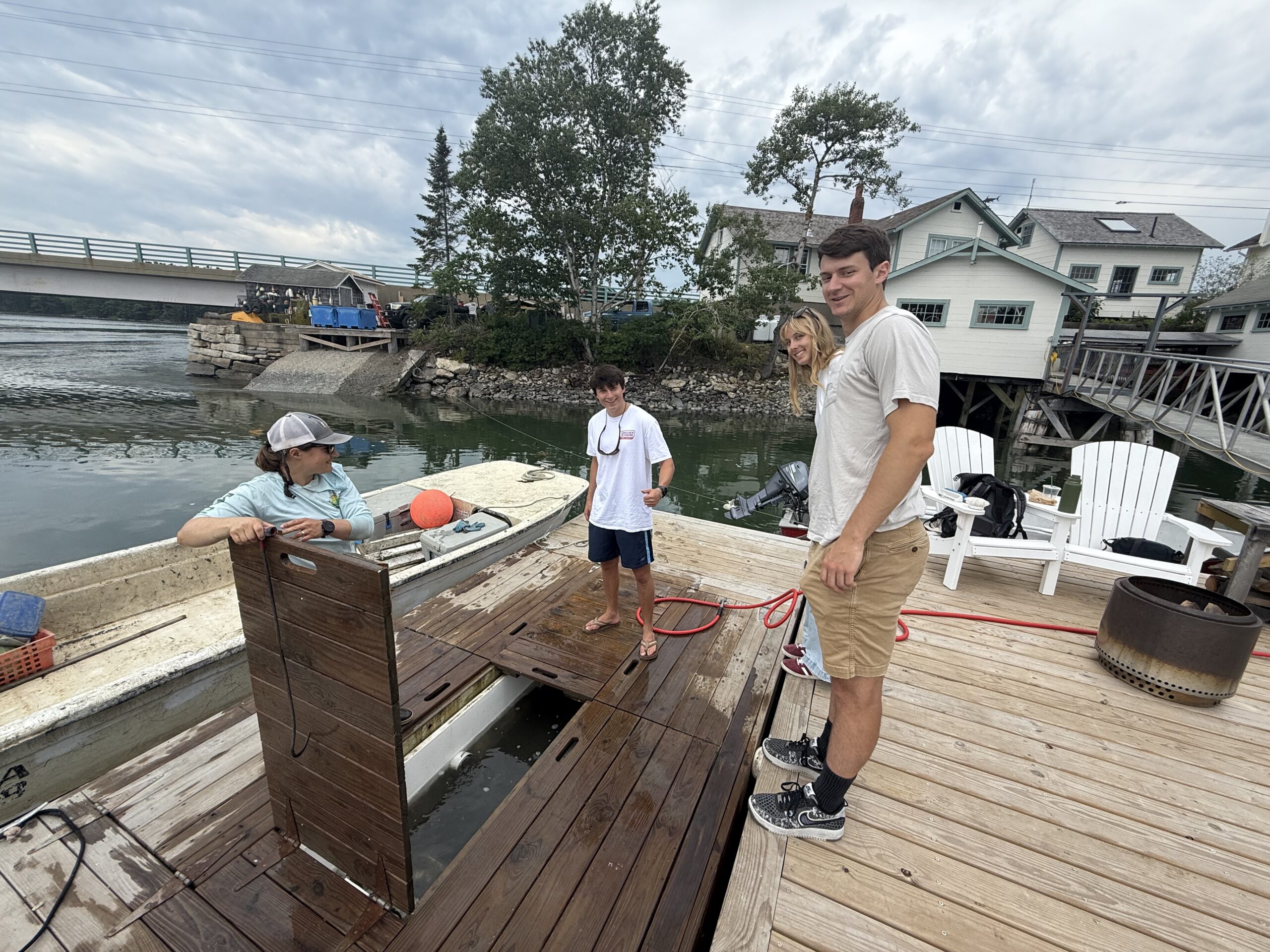 As we entered 2025, we knew we needed to repeat our failed experiment at a new location, specifically a place that had less fresh water influence, which quahogs are sensitive to. Luckily, one of our project partners, Dan Devereaux, the Coastal Resource Officer for the town of Brunswick, had a place in mind. The previous year, the Coastal Resource Office had conducted their own upweller experiments with quahogs at a place called Gurnet Village. Gurnet Village is a privately owned property that was purchased by Blake Civiello and Lili Liu in 2018. Historically, the property was an important working waterfront utilized by many local fishermen, and Blake and Lili were committed to maintaining this working waterfront status when they purchased the property and relocated to Maine from Los Angeles. They graciously agreed to let us run our experiments on their property in 2025, and we had the pleasure of working alongside lobstermen and oyster farmers who also utilize the property, as well as tourists who frequent the Airbnb rental Blake and Lili run.